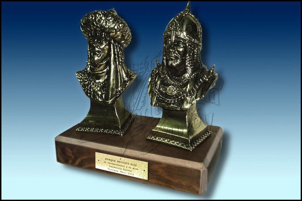 Busto de Capitán moro y cristiano relizado en resina con baño de bronce. Fijados a soporte de madera. Posibilidad de colocar placa con inscripción.