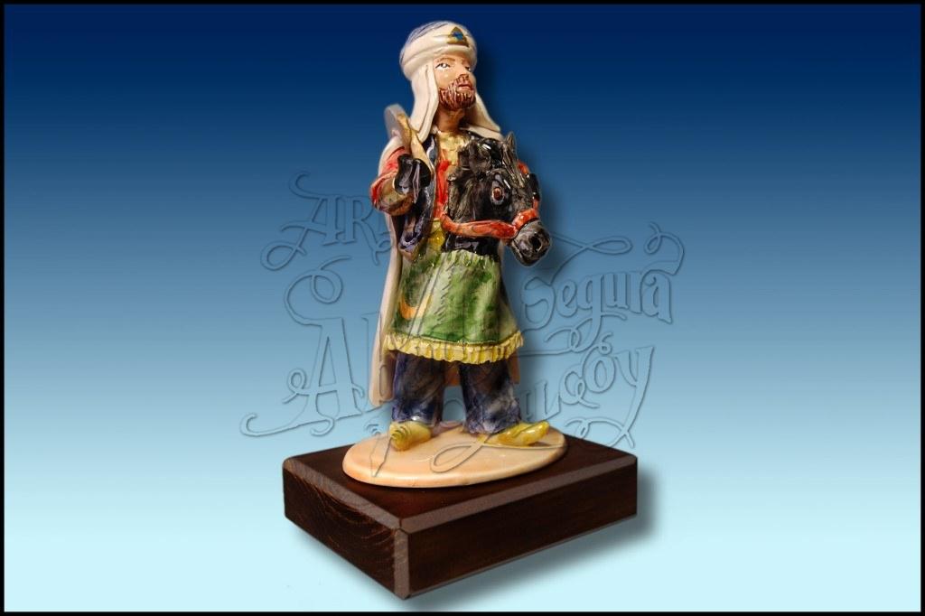 Figura representativa de la indumentaria de "cavallet" de la Filà Realistas de Alcoy. Realizada en cerámica, pintada a mano, a color. Sobre peana de madera lacada.