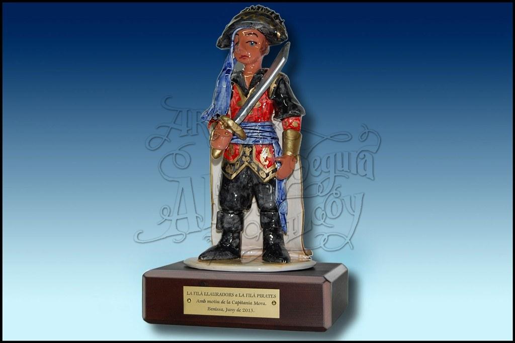 Figura representativa de la Fila Piratas de Benissa. Realizada en cerámica, pintada a mano. Sobre peana de madera lacada.