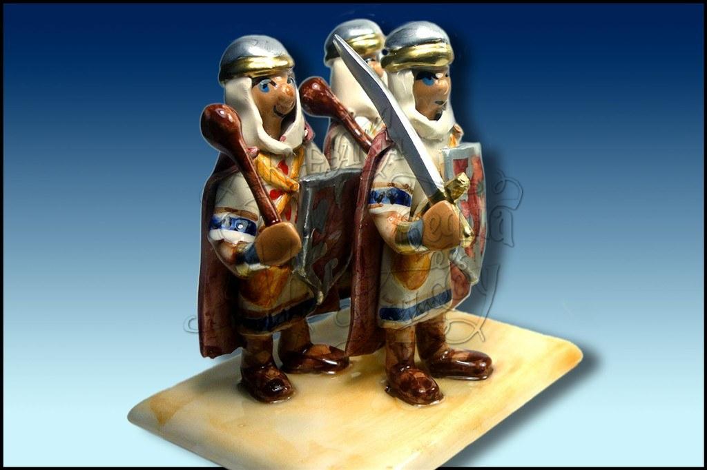 Pieza compuesta de 3 figuras de cristiano (Filà Vascos de Alcoy), dos haciendo escuadra y uno delante, de cabo. Colocados sobre una base rectangular. Réplica de la que aparece en el Belem de Tirisiti. Podemos realizar cualquier traje moro o cristiano, e incluso femenino.