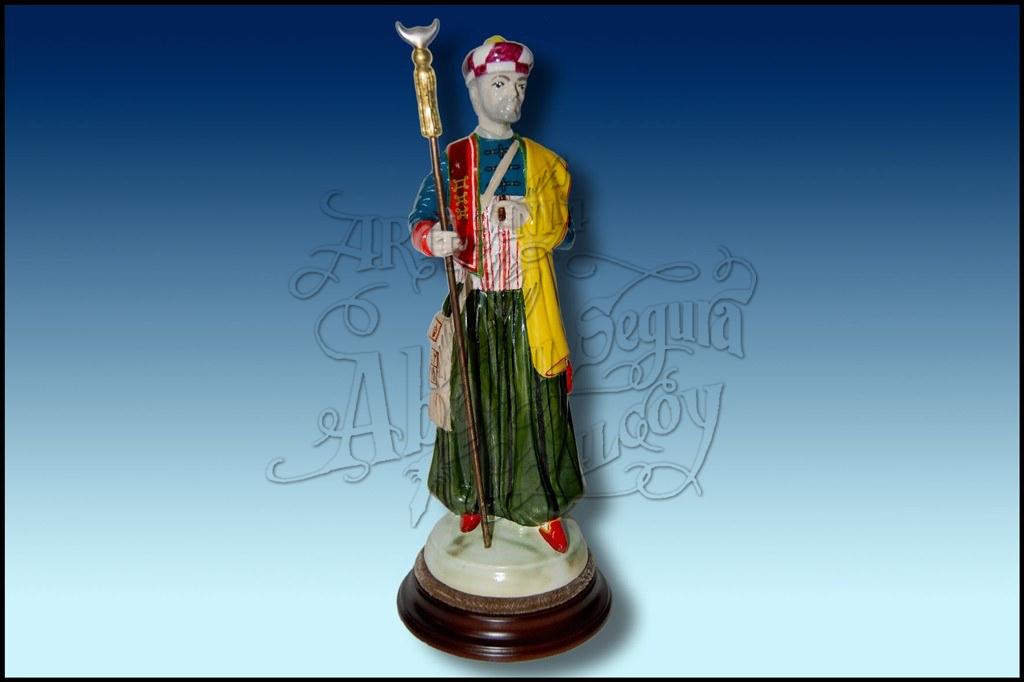 Figura de porcelana pintada a mano a todo color de la Fila Domingo Miques de Alcoy. Con arma de metal y sobre peana redonda.