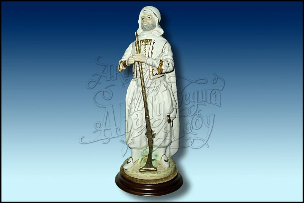 Figura de porcelana pintada a mano Filá Mudéjares de Alcoy. Con espindarga o lanza. Sobre peana redonda y posibilidad de placa con inscripción.