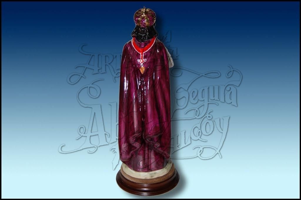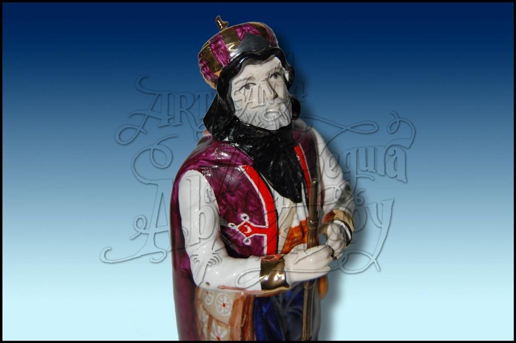 Figura realizada en porcelana, pintada a mano a todo color, de la Comparsa Huestes del Califa de Elche. Con arma de metal y peana de madera y terciopelo.