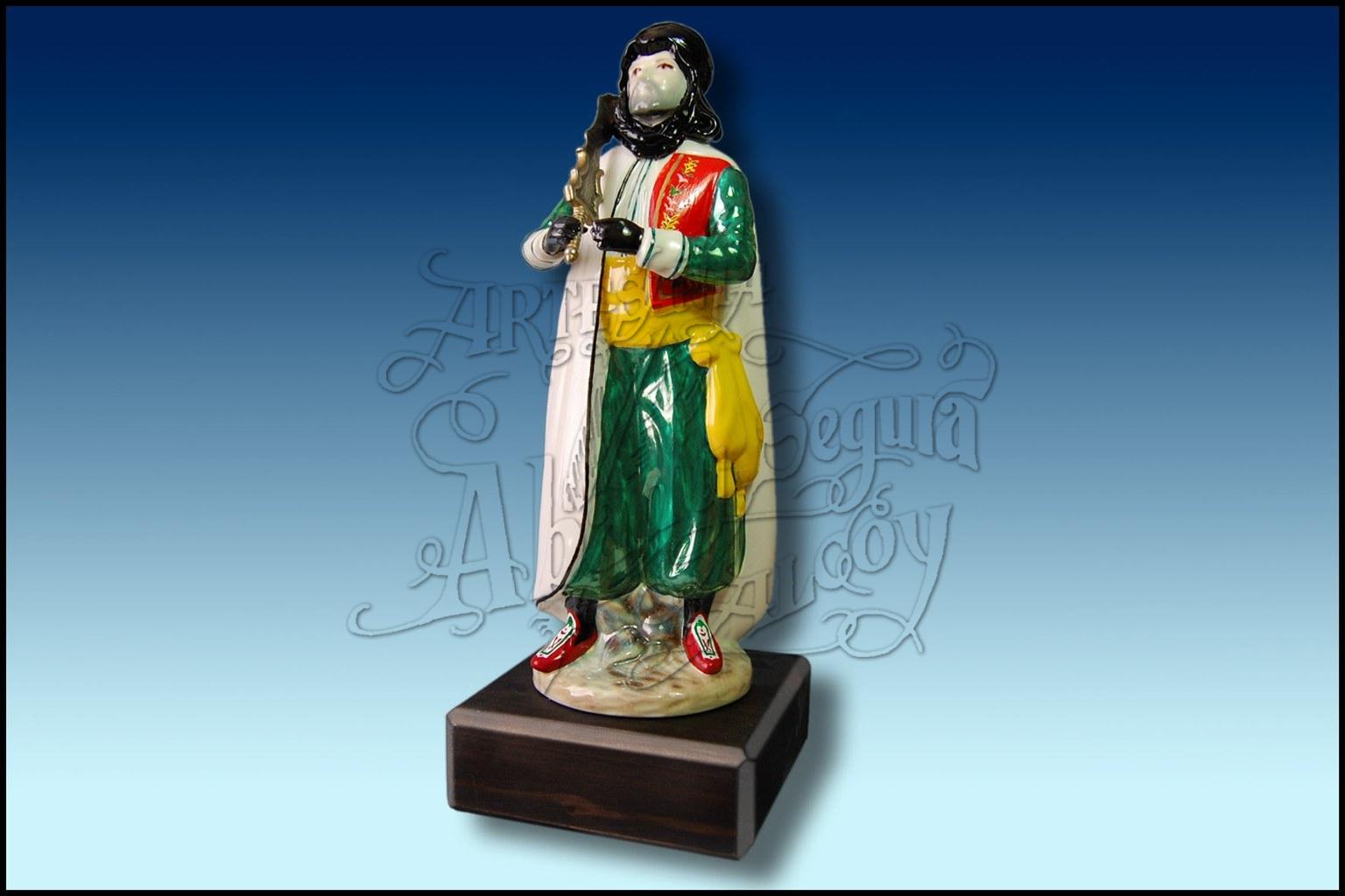 Figura de la Fila Califes de Banyeres. Realizada en porcelana, pintada a mano a todo color, con arma de metal. Sobre peana redonda. Posibilidad de placa con inscripción.