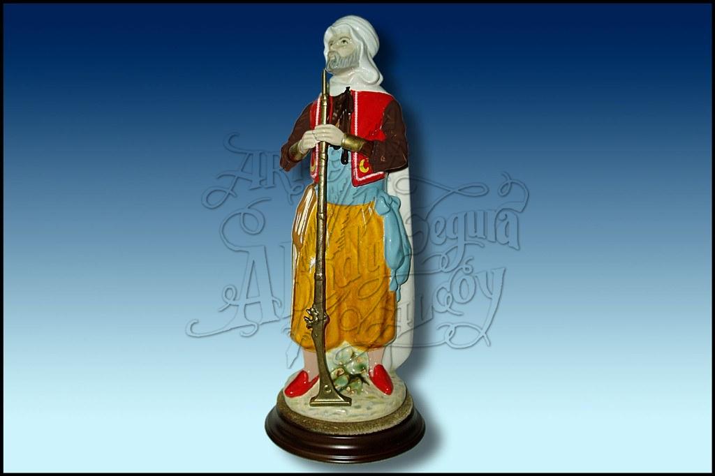 Figura de porcelana pintada a mano a todo color de la Filá Marrocs de Xixona. Sobre peana redonda y posibilidad de placa con inscripción. Con arma. Disponemos de varios modelos de las filaes de Xixona. A consultar.