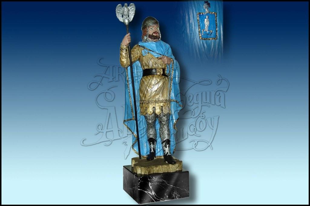 Figura representativa de la indumentaria de la Comparsa Caballeros Halcones de Elche. Realizada en resina, pintada a mano a todo color. Sobre base de madera (redonda o cuadrada, a elegir)