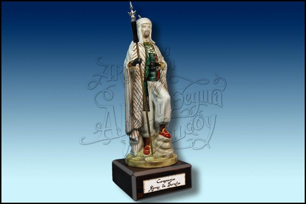 Figura con la indumentaria de la Fila Moros de Bernia de Altea. Realizada en porcelana, decorada a mano, a todo color. Sobre peana de madera. Arma realizada en metal.