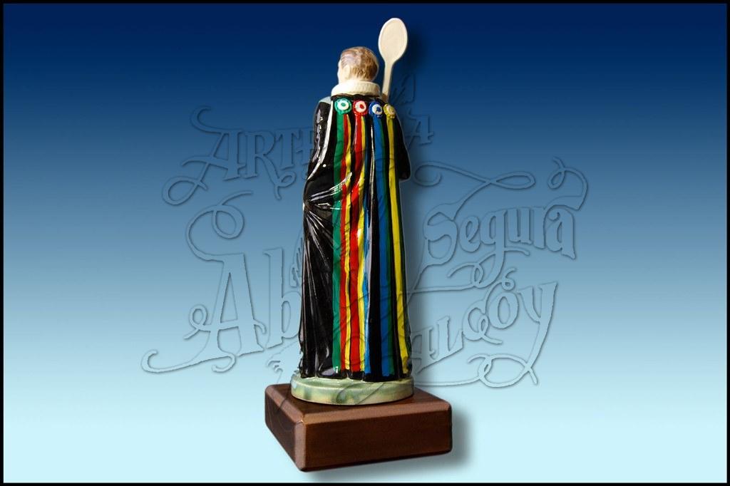 Realizada en porcelana, pintada a mano a todo color. Sobre peana redonda de madera y terciopelo.