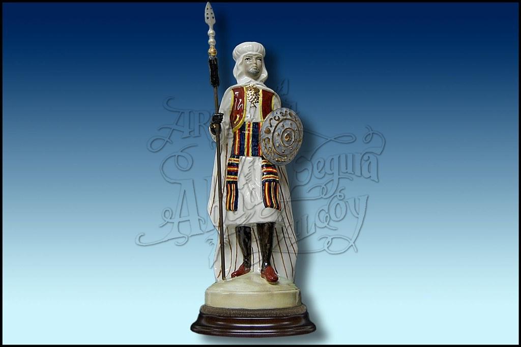 Figura de la Comparsa Moros Tariks de Biar. Realizada en porcelana, pintada a mano a todo color, con arma de metal. Sobre peana redonda. Posibilidad de placa con inscripción.