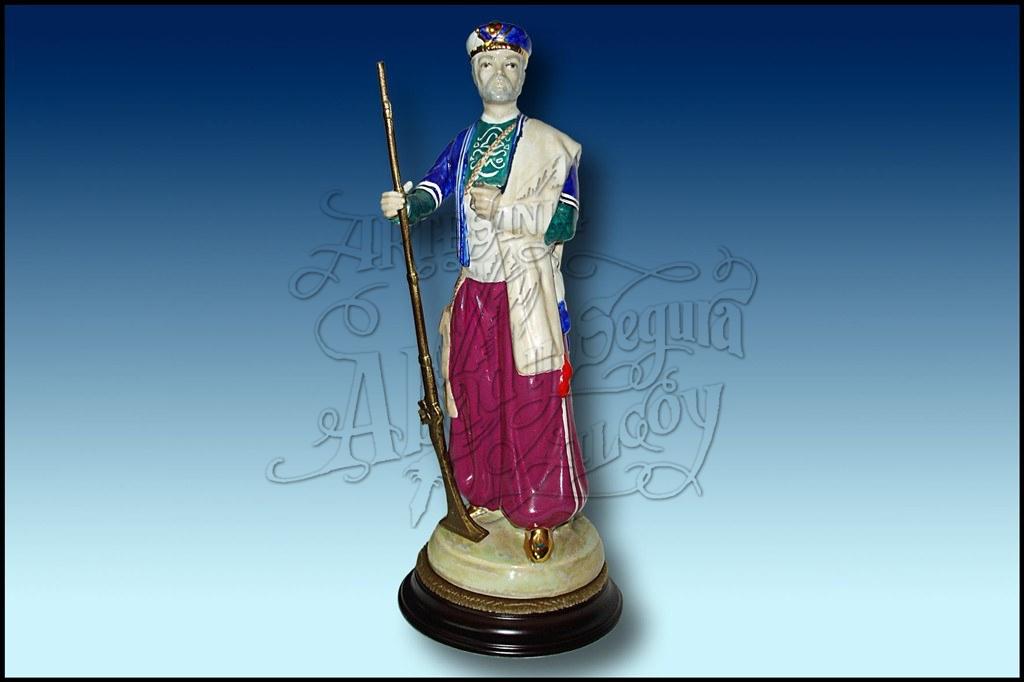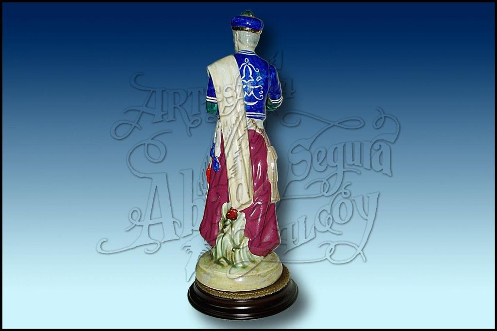 Realizada en porcelana, pintada a mano a todo color, con arma de metal. Sobre peana redonda. Posibilidad de placa con inscripción.