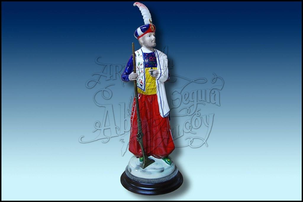 Figura de la Fila Moros Nous de Banyeres. Realizada en porcelana, pintada a mano a todo color, con arma de metal. Sobre peana redonda. Posibilidad de placa con inscripción.