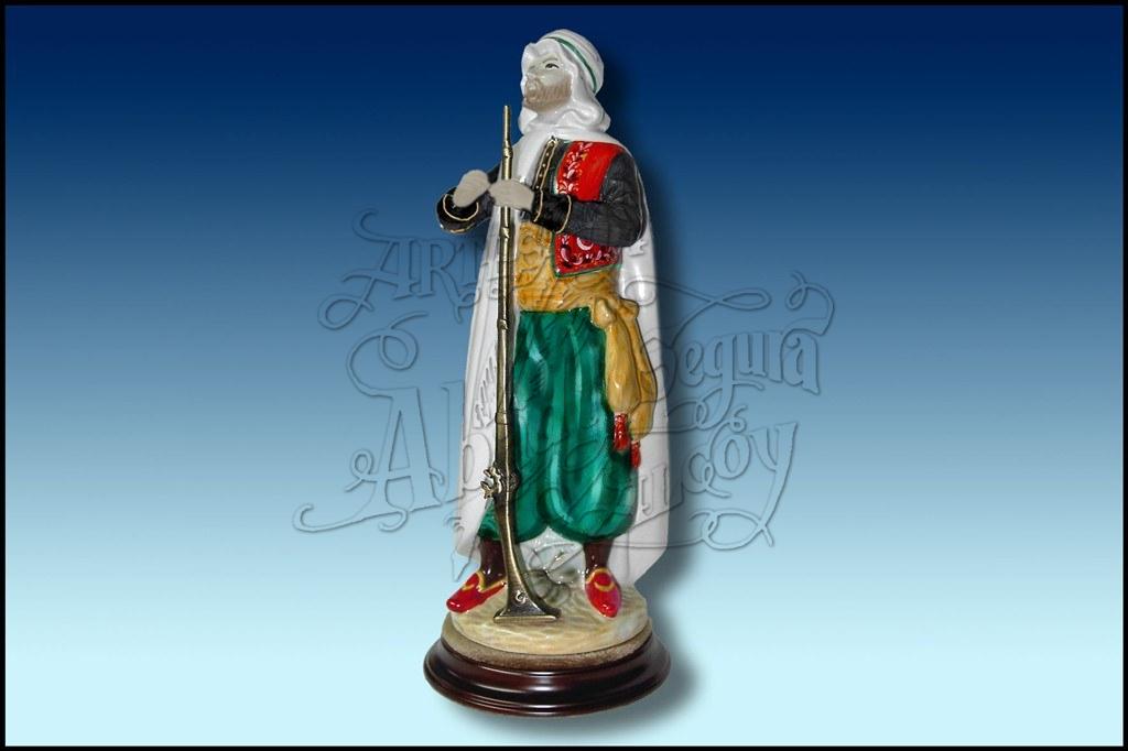 Figura de la Fila Moros Verds de Xixona. Realizada en porcelana, pintada a mano a todo color, con arma de metal. Sobre peana redonda. Posibilidad de placa con inscripción.