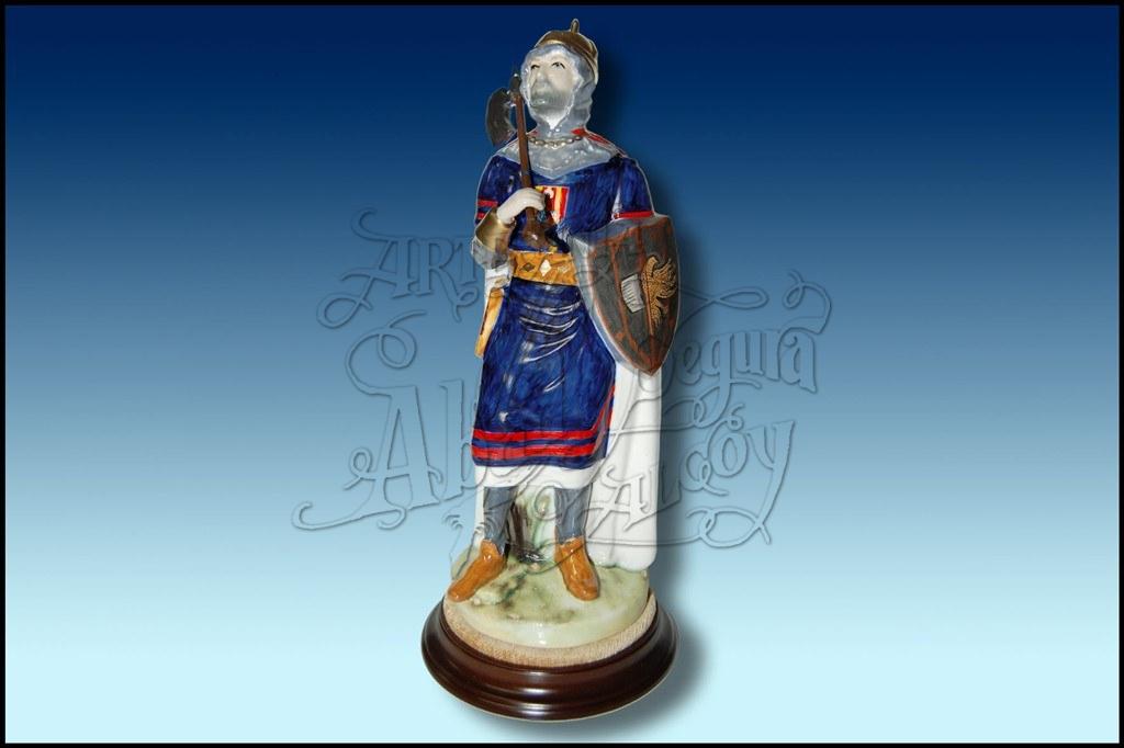 Figura de la Fila Almogavares de Cocentaina. Realizada en porcelana, pintada a mano a todo color, con arma de metal. Sobre peana redonda. Posibilidad de placa con inscripción.
