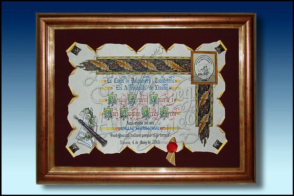Pergamino de homenaje con cenefa, escudo y alegoria a la parte izquierda.