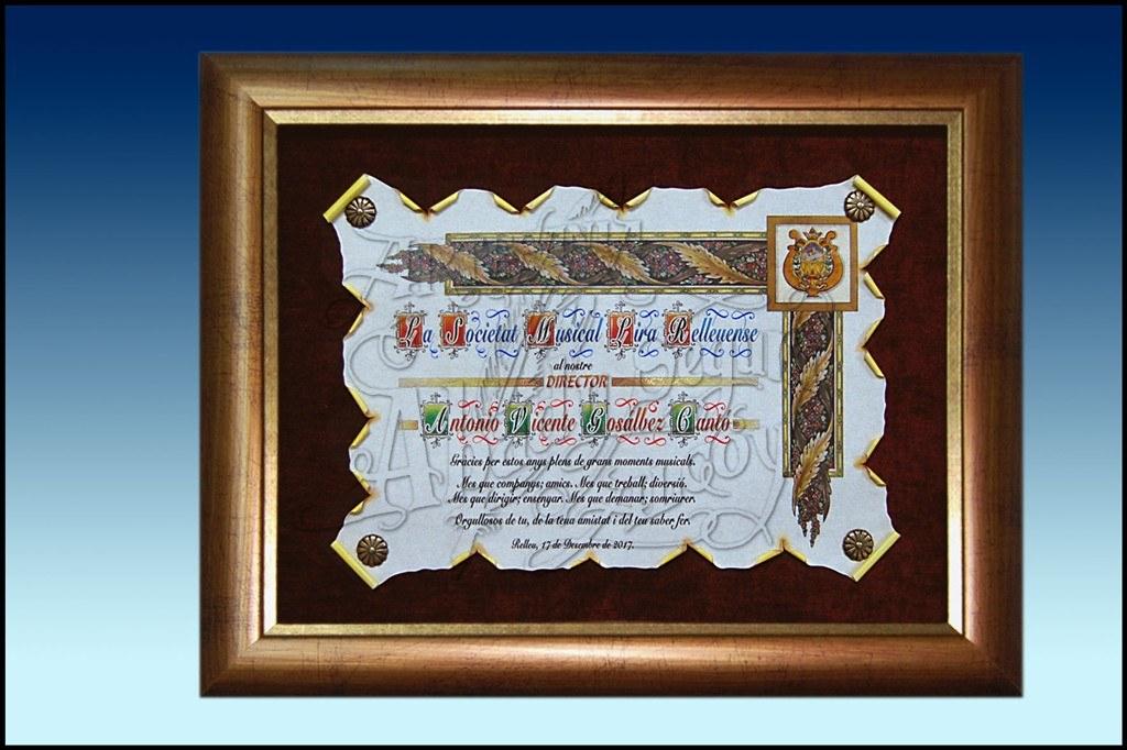Pergamino de homenaje en papel apergaminado, enmarcado con marco rústico, sobre terciopelo y clavos de bronce.