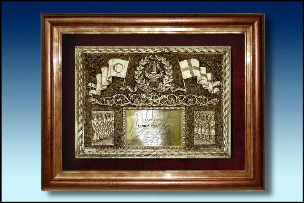 Placa alegórica a la música festera en tono marfil, sobre terciopelo con marco rústico. Texto con inscripción sobre metal
