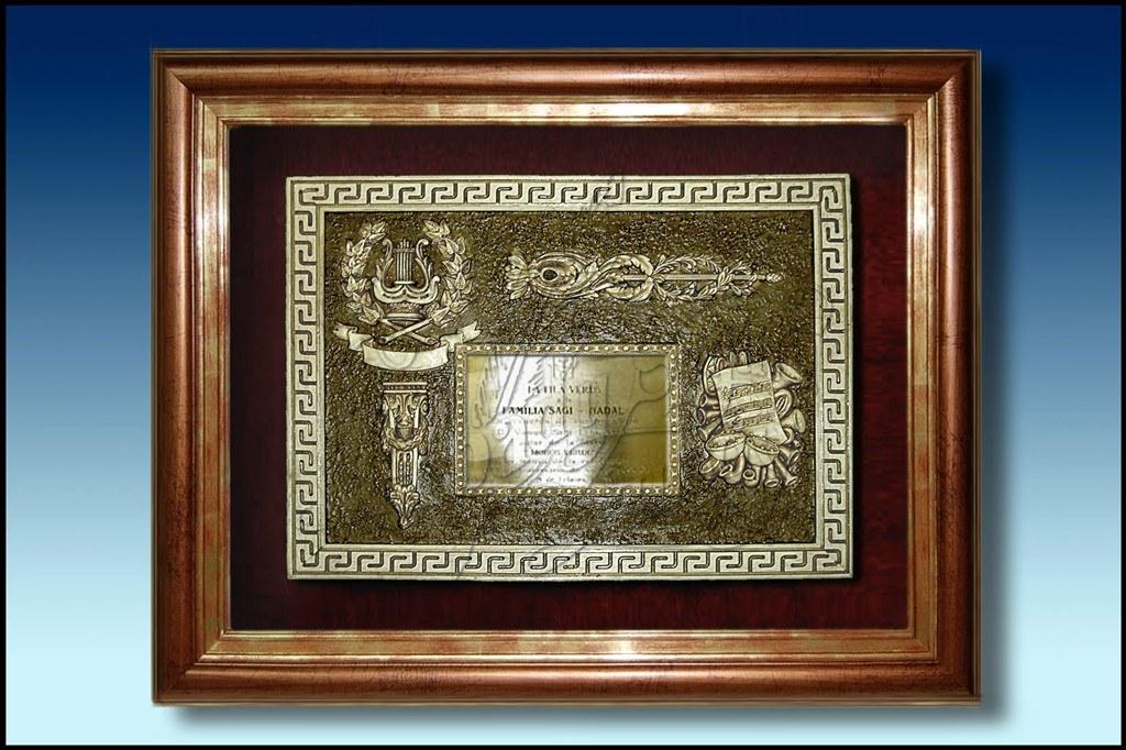 Placa alegórica a la música en tono marfil, sobre terciopelo con marco rústico. Texto con inscripción sobre metal