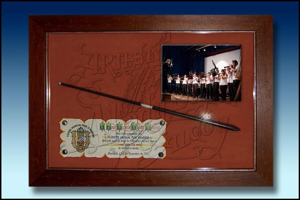 Batuta de madera de ébano con apliques en plata, acompañada de cartela con inscripción y fotografia.