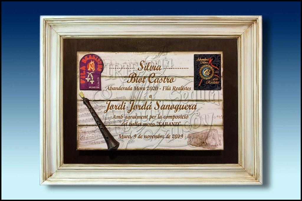 Placa conmemorativa con instrumento en bajorrelieve, con elementos y dibujos personalizados. Se puede realizar de cualquier músico, instrumento o incluso con dibujos de otras temáticas diferentes.