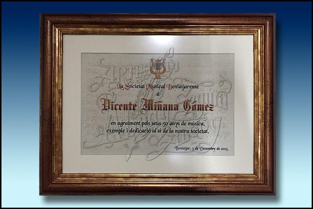 Diploma homenaje con dedicatoria y partituras de fondo, realizadas en papel de pergamino. Enmarcado con con moldura imitacion a pan de oro, en tono cobre. Cristal mate.