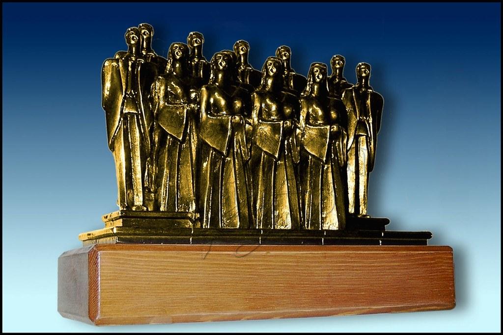 Figura representando un coro, realizado en resina, acabado en bronce, sobre peana de madera.