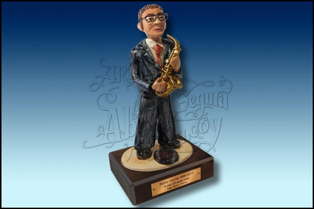 Figura representativa de un músico, con el instrumento que se desee y le elaboramos rasgos de la cara y pelo personalizados. Podemos realizar otras indumentarias y tamaños.