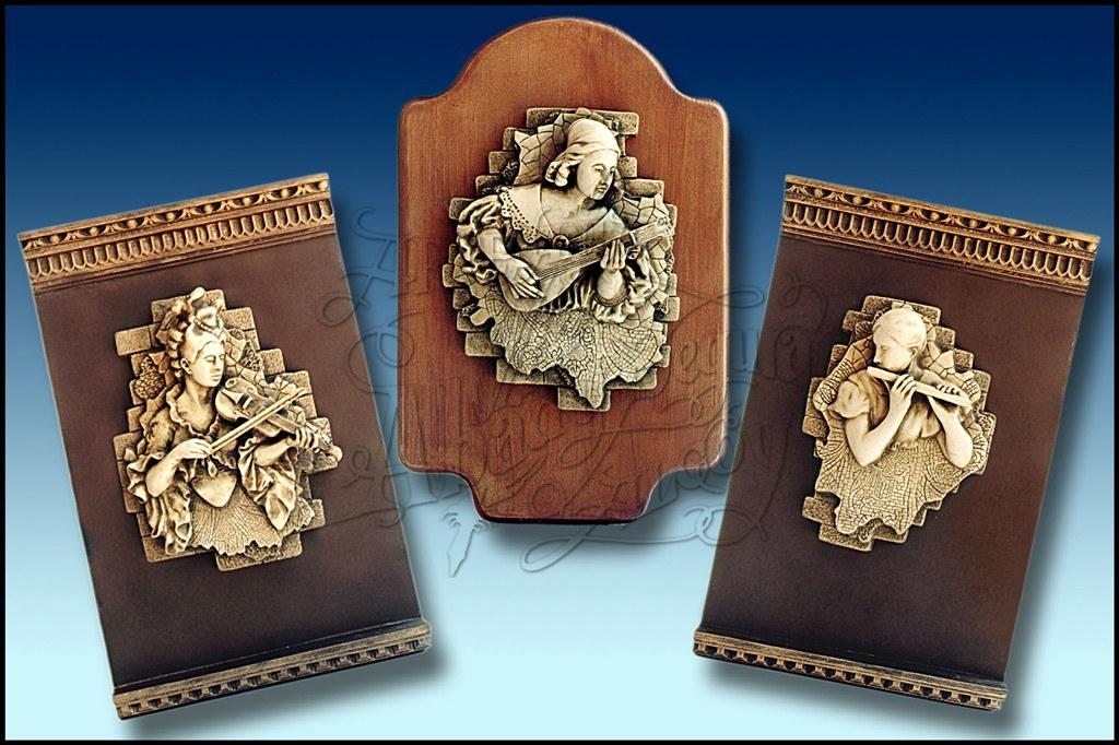 Realizadas en resina, acabado marfil. Los frisos estan realizados en resina, acabados en bronce mate y la panoplia esta realizada en resina, acabada en imitación a madera.