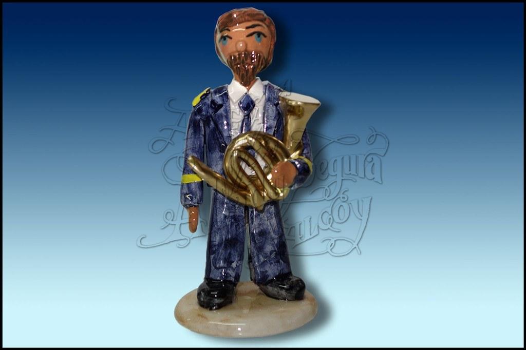 Figura representativa de un musico chico, con trompa. Realizada en cerámica, pintada a mano, a todo color.