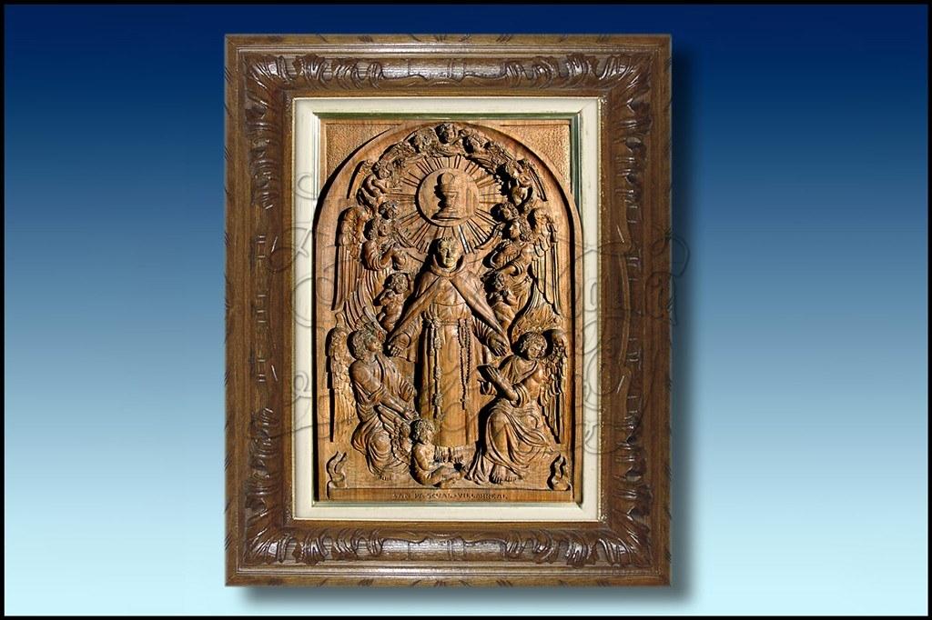 Realizado en resina, acabado imitacion a madera. Enmarcado con marco tallado a mano.
