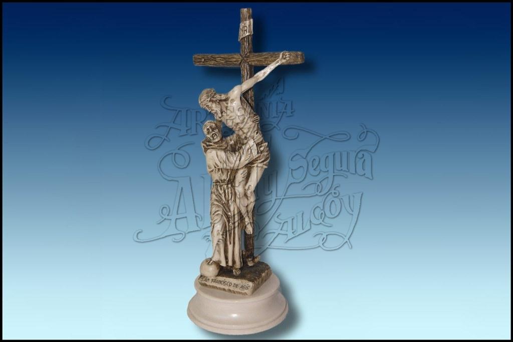 Figura corpórea del santo italiano, diácono, fundador de la Orden Franciscana, San Francisco de Asís abrazando a Jesús en la Cruz.