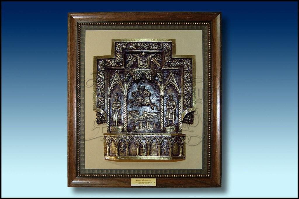 Retablo alegórico a la protección que ejerció San Jorge al pueblo de Alcoy en 1255 (según cuenta la leyenda). A ambos lados aparecen las figuras de los dos caudillos enfrentados, Al-Azraq y Jaume I. Vista del Barranc del Sinc y del Alcoy amurallado.