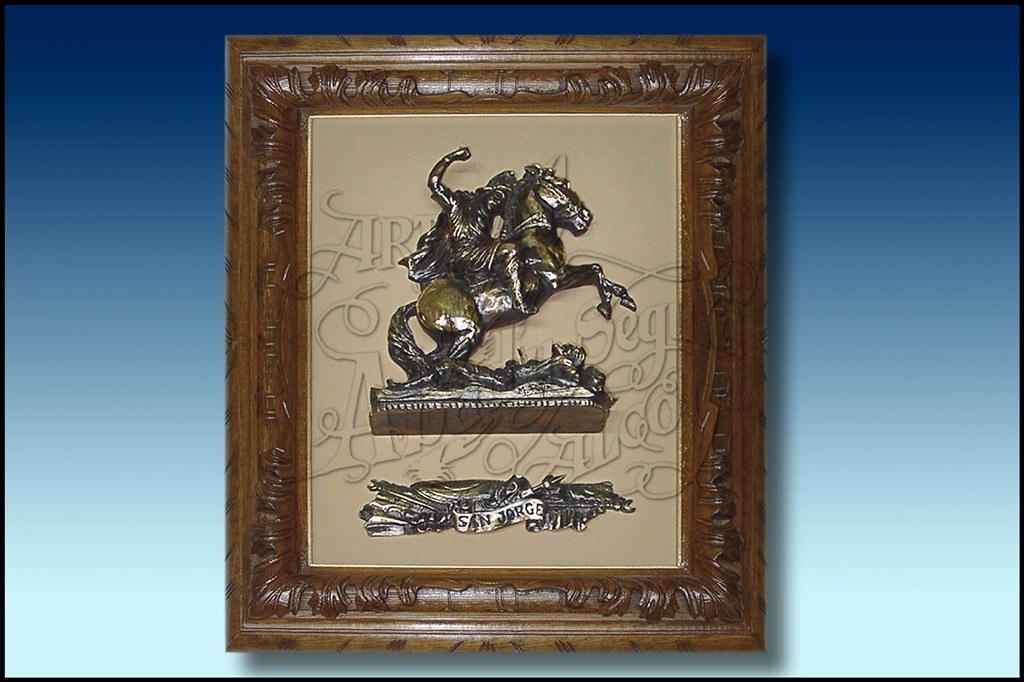 San Jorge realizado en bajorrelieve con cartela donde va colocado su nombre. Enmarcado con marco de talla en madera. Puede enmarcarse en marco rústico. Se le puede añadir placa con inscripción.
