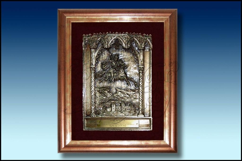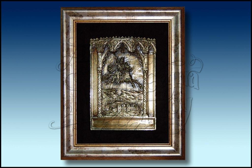 Realizado en resina, acabado en bronce. Puedes comprar San Jorge de Alcoy con marco rústico o moderno.