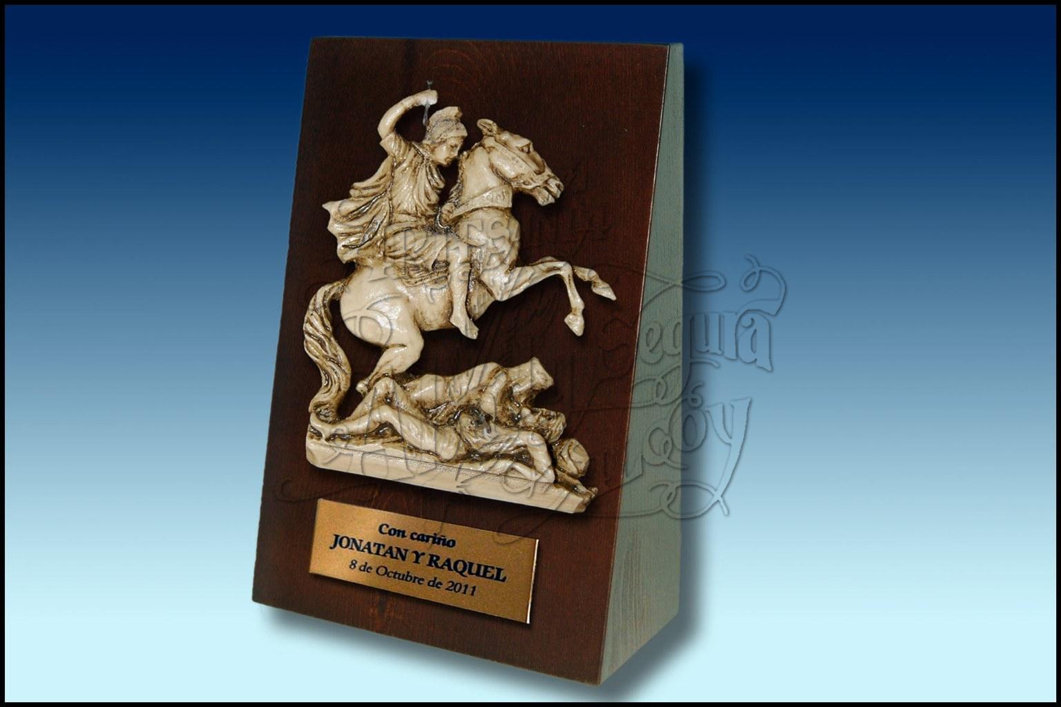 Figura en bajorrelieve de San Jorge a caballo, sobre soporte de madera.