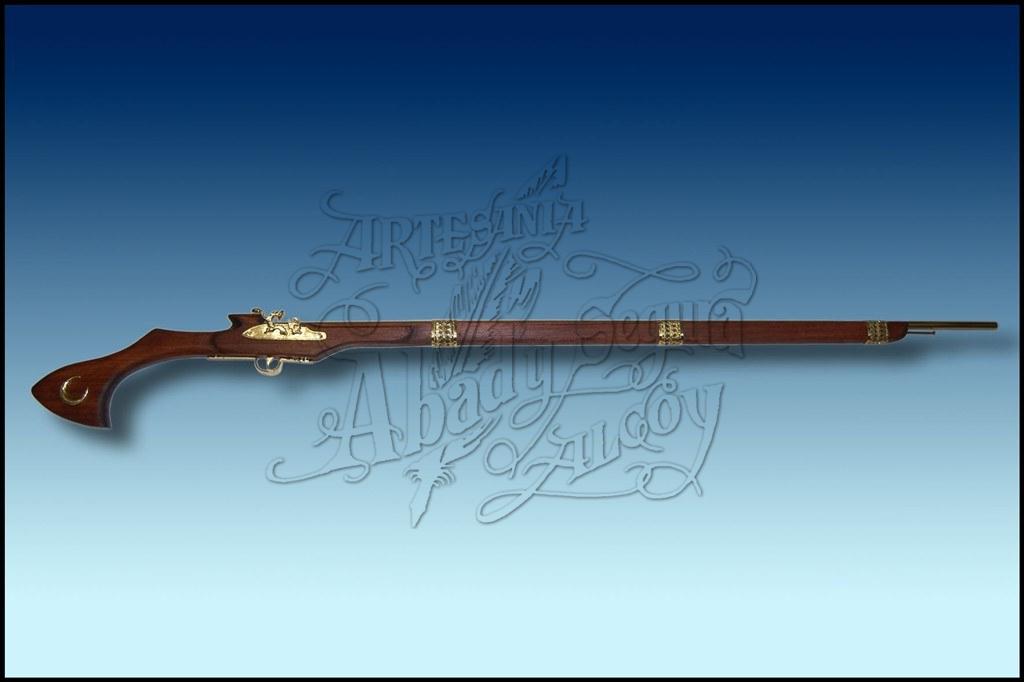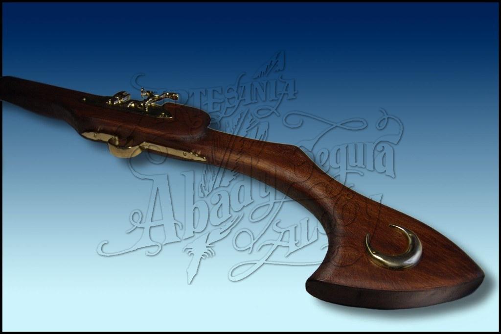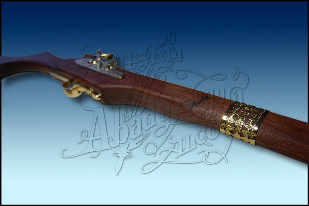 Espingarda decorativa para desfilar (no para disparar). Realizada artesanalmente en madera, con ornamentos arabes de metal. Se puede elegir el tono de la madera, el tipo de acabado (brillo o mate) y los adornos elaborados en dorado, plateado o dorado envevejecido tipo bronce, para adaptarse a la estetica de cada filà o comparsa.