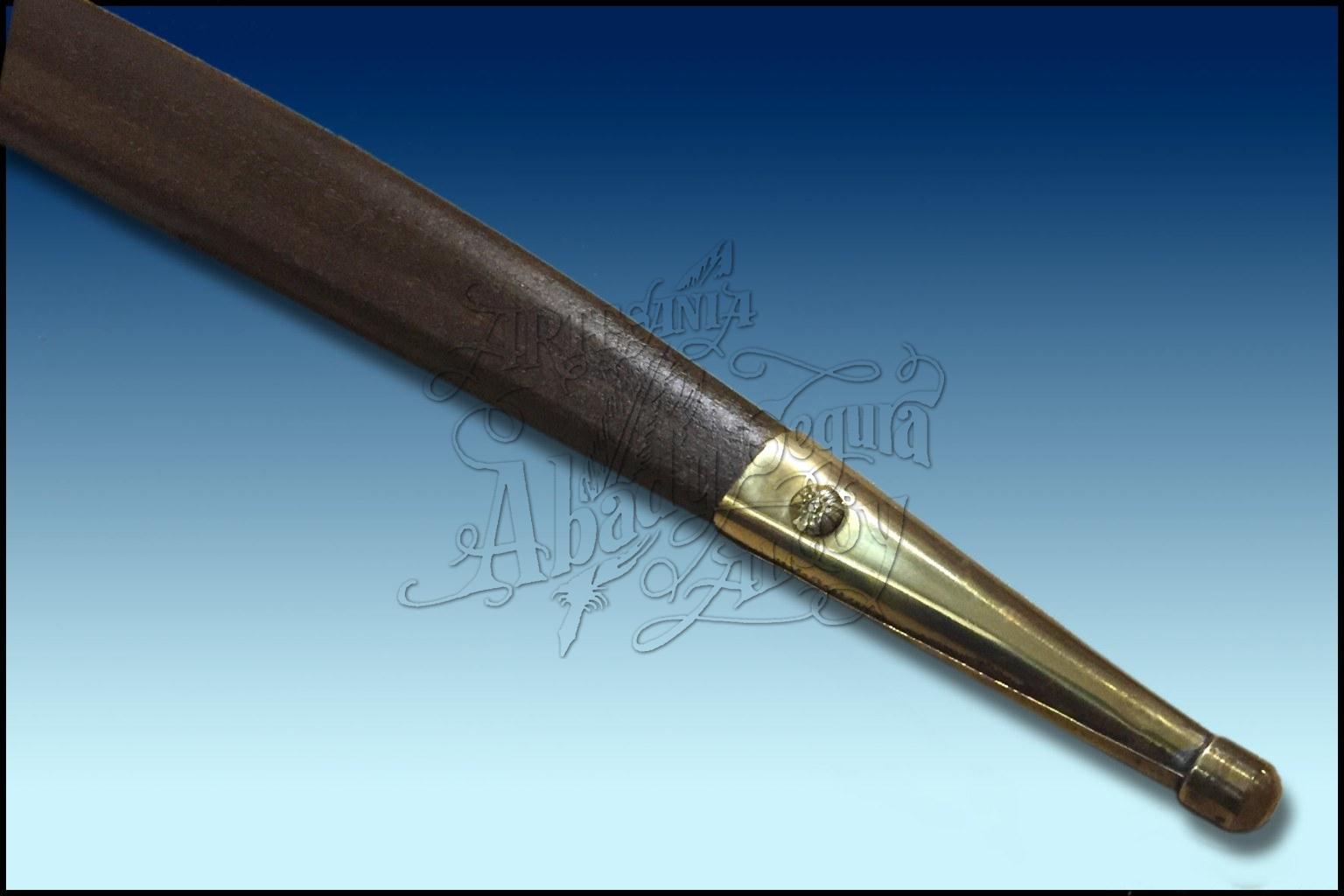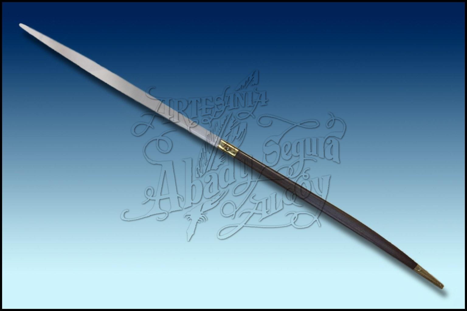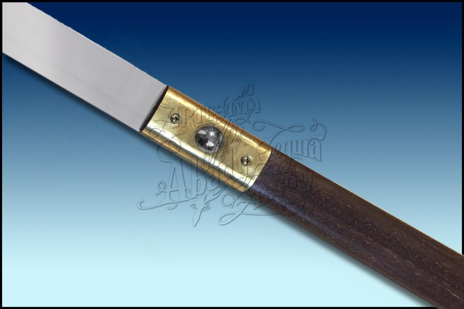 Navaja fija con hoja de alumino pulido plateado. Mango de madera color vengué. Cabeza del mango y rebajo, realizados en laton dorado.