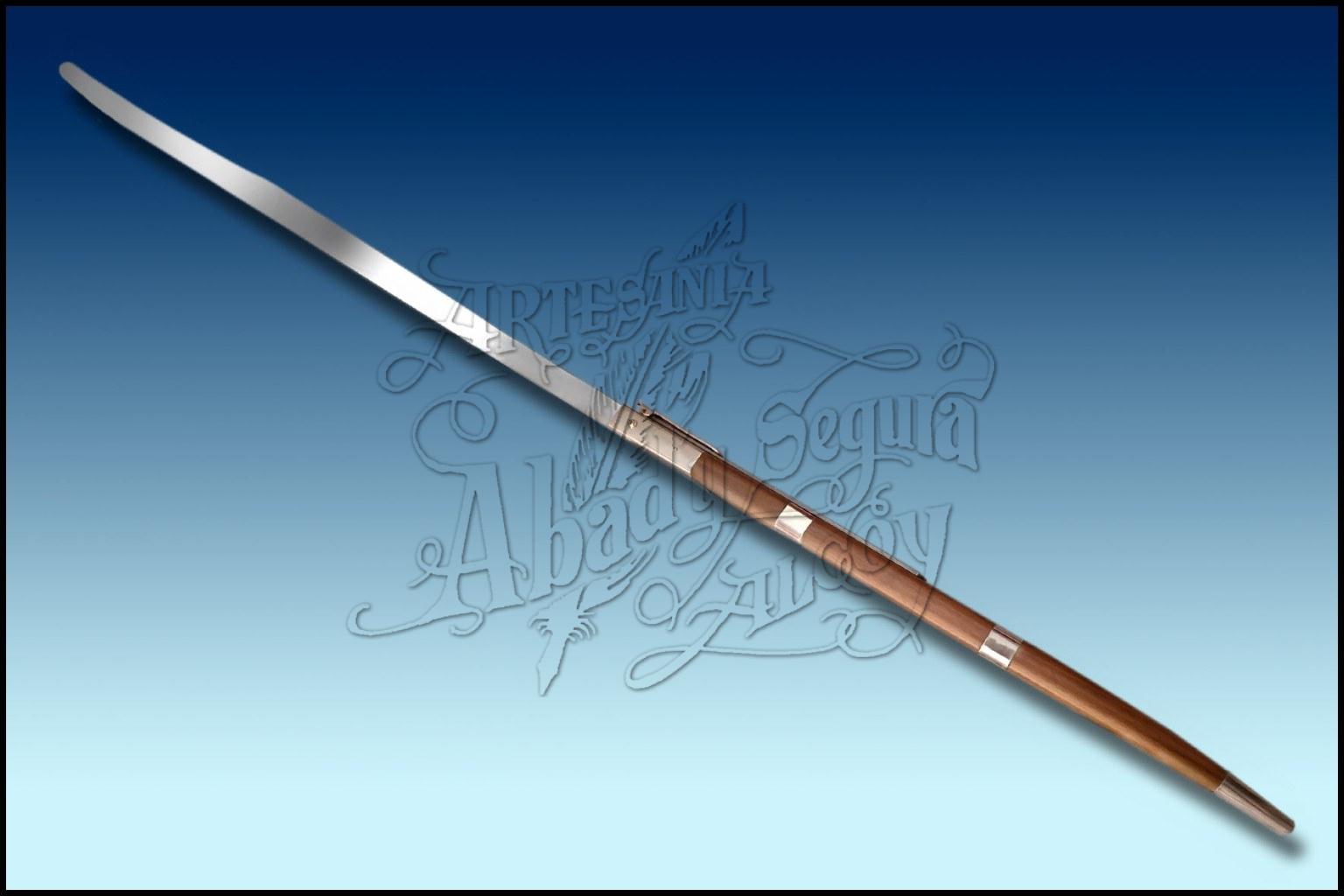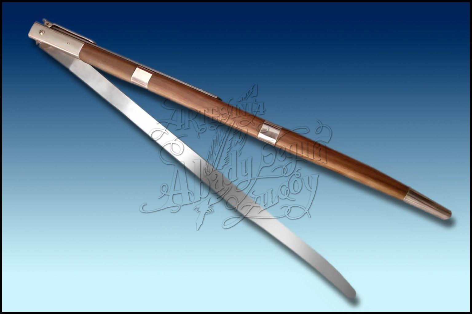 Navaja movil (se abre y se cierra) con hoja de alumino pulido. Empuñadura de madera con adornos acabados en plata. Al ser elaborado en materiales ligeros resulta sumamente cómoda en los desfiles, para hacer el cabo . Especial para comparsas andaluzas, contrabandistas o bandoleros.