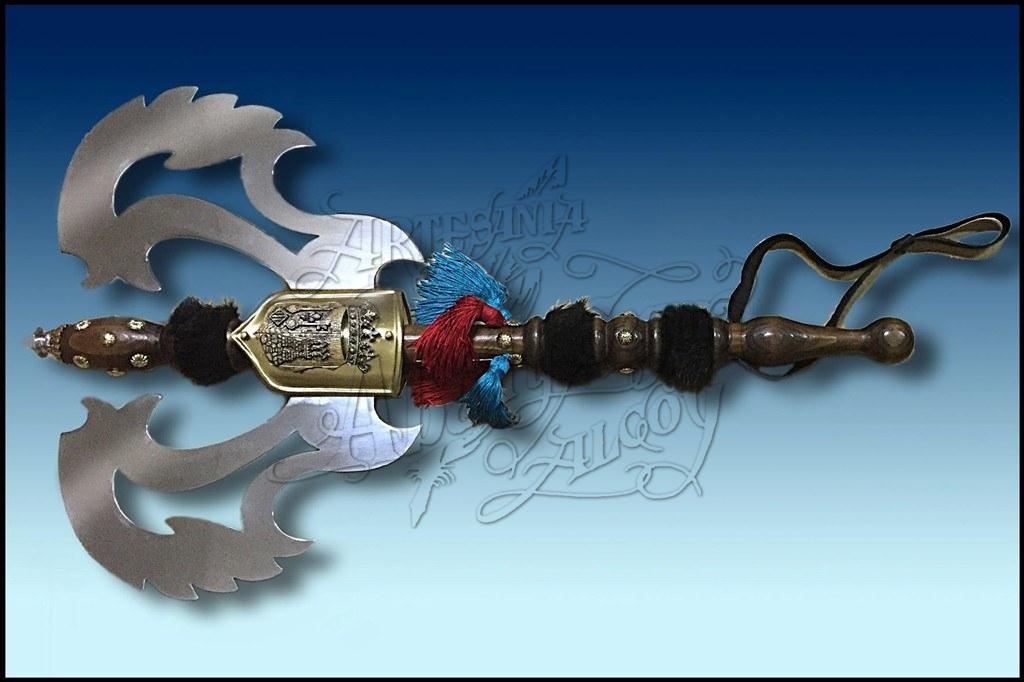 Porra con 2 hojas de alumino pulido. Empuñadura de madera con adornos acabados en plateado o dorado. Escudo entre las dos hojas personalizable. Al ser elaborado en materiales ligeros resulta sumamente cómoda en los desfiles, para hacer el cabo. Con correa de cuero para sujetarla mejor como sistema de seguridad y para poder colgarla.