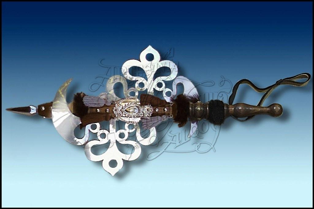 Porra con 2 hojas de alumino pulido, con la forma de la Cruz de Calatrava. Empuñadura de madera con adornos acabados en plateado o dorado. Escudo entre las dos hojas personalizable. Al ser elaborado en materiales ligeros resulta sumamente cómoda en los desfiles, para hacer el cabo. Con correa de cuero para sujetarla mejor como sistema de seguridad y para poder colgarla.
