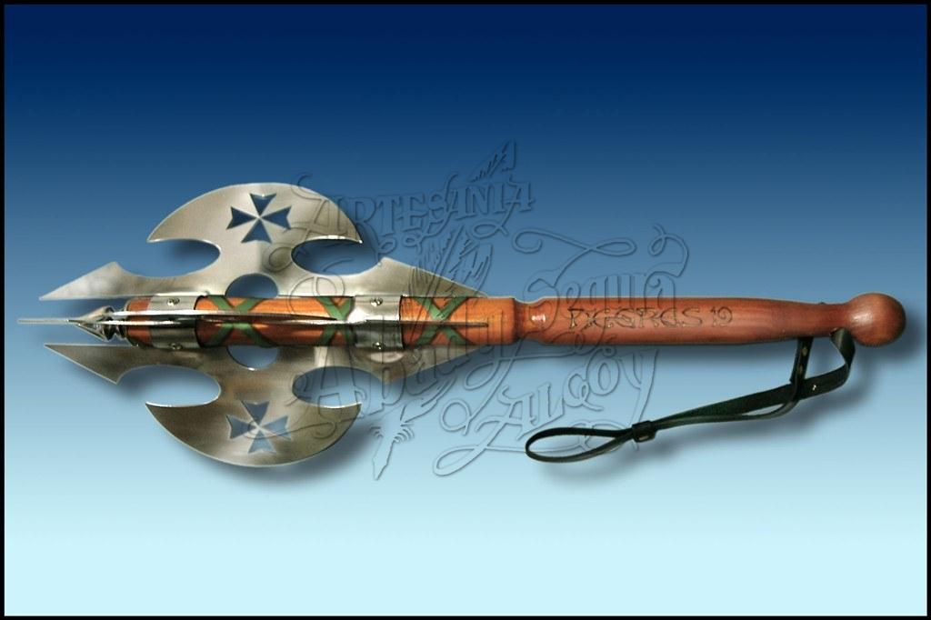 Porra con 4 hojas de alumino pulido, con la forma de la Cruz Templaria perforada en las mismas hojas. Empuñadura de madera con adornos en raso o cuero. Al ser elaborada en materiales ligeros resulta sumamente cómoda en los desfiles, para hacer el cabo. Con correa de cuero para sujetarla mejor como sistema de seguridad y para poder colgarla.