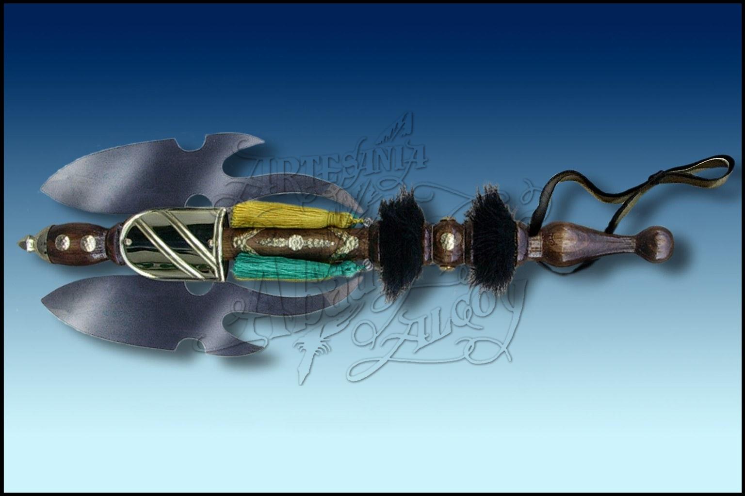Porra con 2 hojas de alumino pulido, con la forma de hacha tradicional. Empuñadura de madera con remaches acabados en plateado o dorado. Escudo entre las dos hojas personalizable. Al ser elaborada en materiales ligeros resulta sumamente cómoda en los desfiles, para hacer el cabo. Con correa de cuero para sujetarla mejor como sistema de seguridad y para poder colgarla.