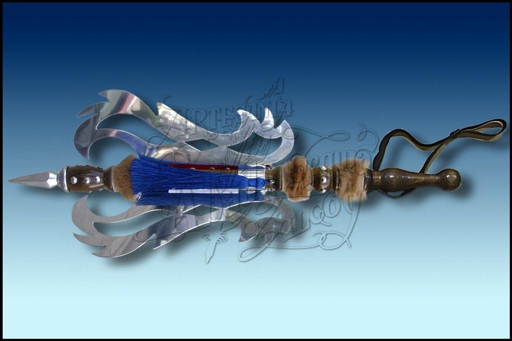 Porra con 3 hojas de alumino pulido. Empuñadura de madera con remaches acabados en plateado o dorado. Escudo entre las dos hojas personalizable. Al ser elaborada en materiales ligeros resulta sumamente cómoda en los desfiles, para hacer el cabo. Con correa de cuero para sujetarla mejor como sistema de seguridad y para poder colgarla.