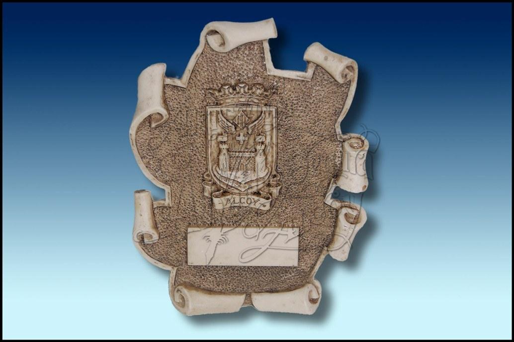 Escudo de Alcoy en pequeño sobre una cartela decorativa. Detrás lleva un pie o bien un bolsillo a modo de posalápices. Adhesivo con inscripcion gratuito.