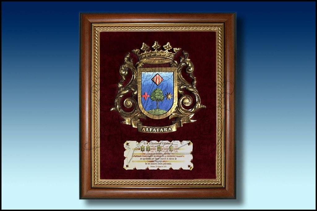 Escudo de Alfafara en bajorrelieve pintado todo a mano ensalzado con lambrequin de bronce. Sobre terciopelo en marco rústico. Posibilidad de cambiar por marco de talla de madera.