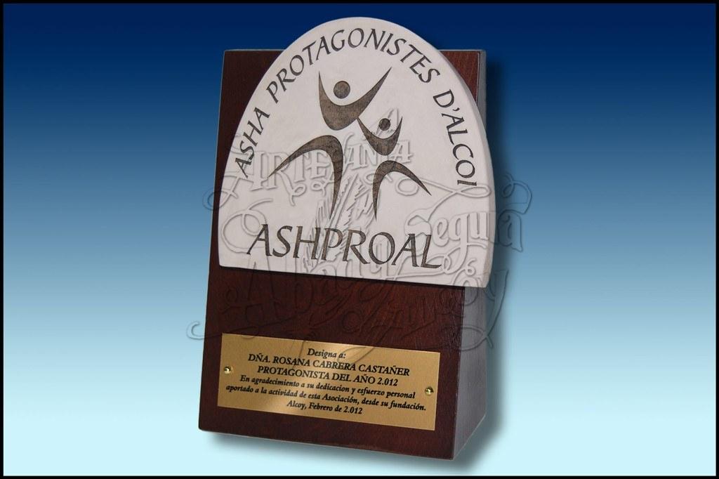 Realizado en resina, acabado marfil, colocado sobre base de madera. Placa con inscripcion metalica.