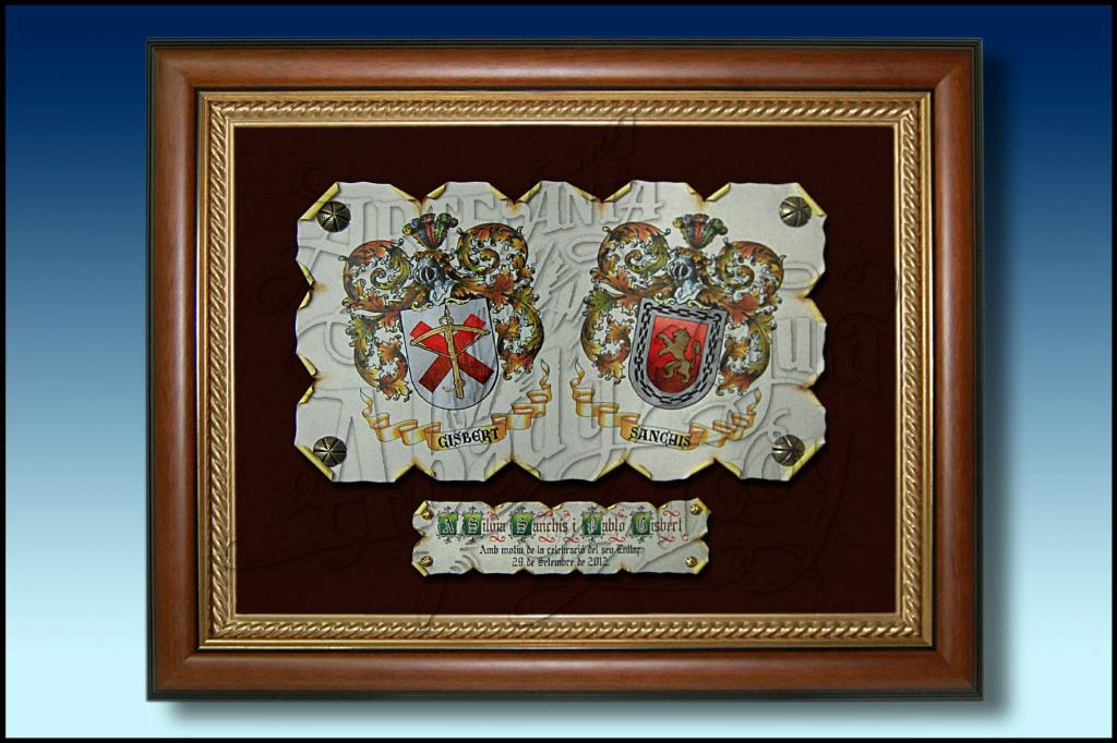 Escudos heraldicos de los apellidos, realizados sobre papel imitacion a pergamino. El losanje dibujado y pintado a mano. Sujeto con clavos decorativos de bronce, sobre fondo de terciopelo.