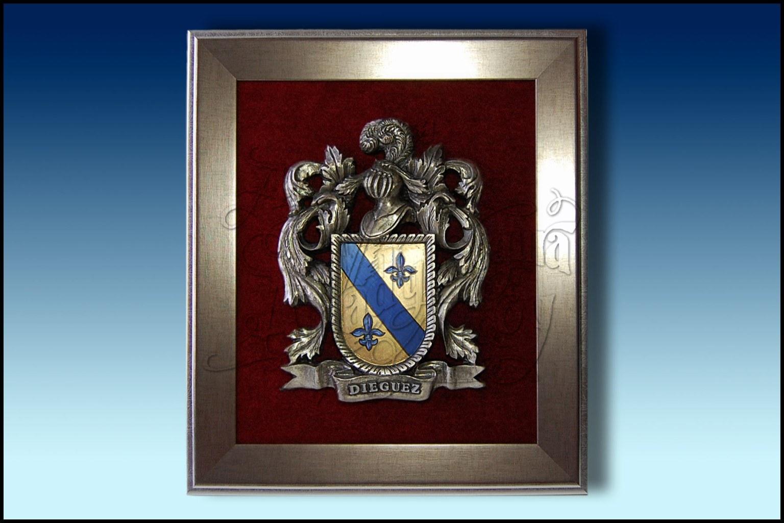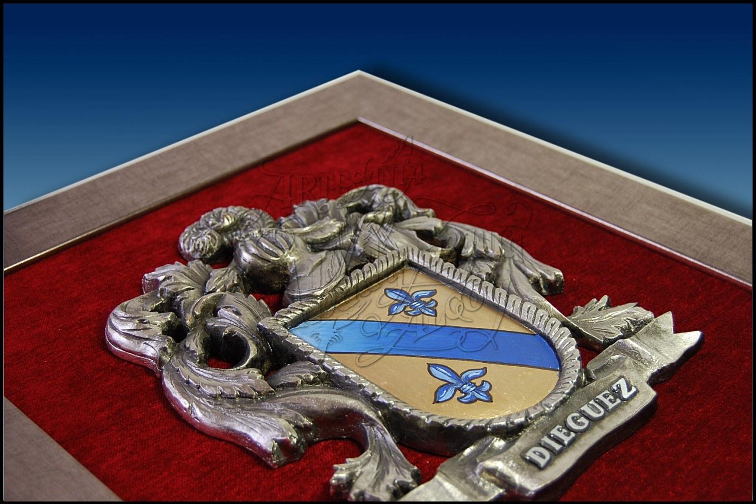 Escudo del apellido en bajorrelieve, realizado en resina, acabado en plata. El losanje, dibujado y pintado a mano en nuestro taller. Las letras del propio apellido, en relieve.