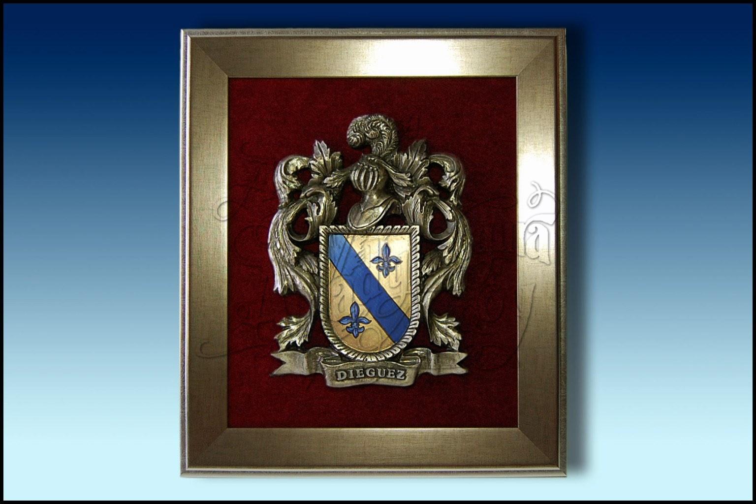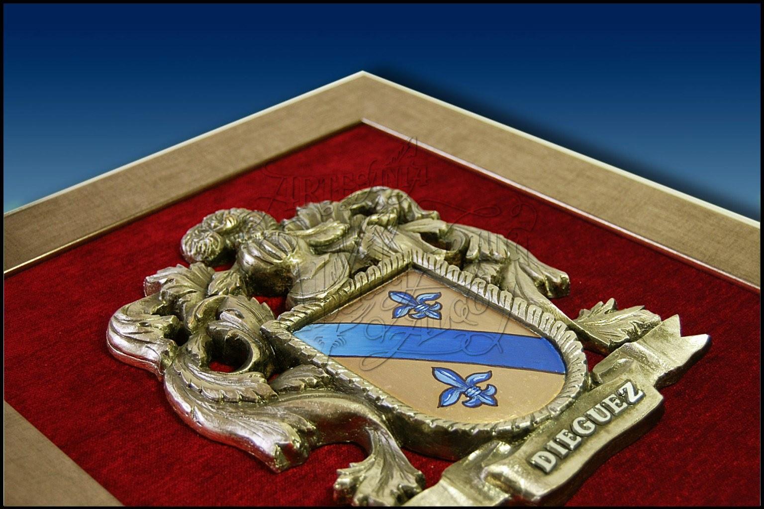 Heráldica del apellido en bajorrelieve, realizado en resina y bañado en bronce. El escudo de la heráldica está dibujado y pintado a mano. Las letras del propio apellido, están realizadas en relieve.