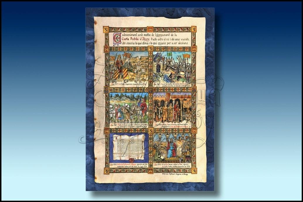 Lámina que recrea una de las hojas de las Cantigas, donde se narra la historia del otorgamiento de la Carta Pobla de Alcoy y para qué se utilizaba este documento.
