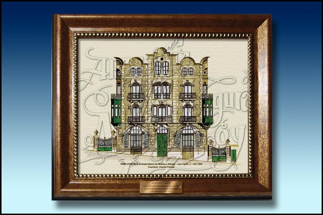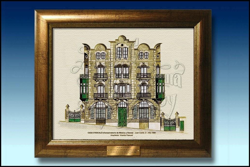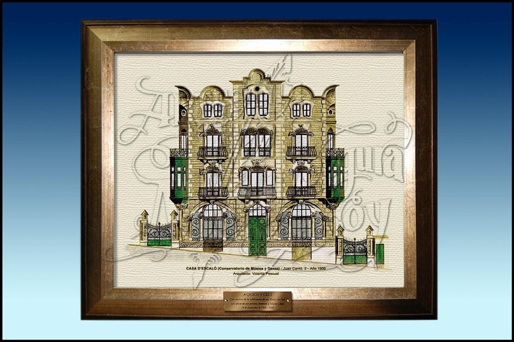 Lámina en tela lienzo del dibujo de la fachada del Conservatorio de Musica y Danza de Alcoy, conocido como "Casa Escaló", cuyo original está hecho en acuarela.